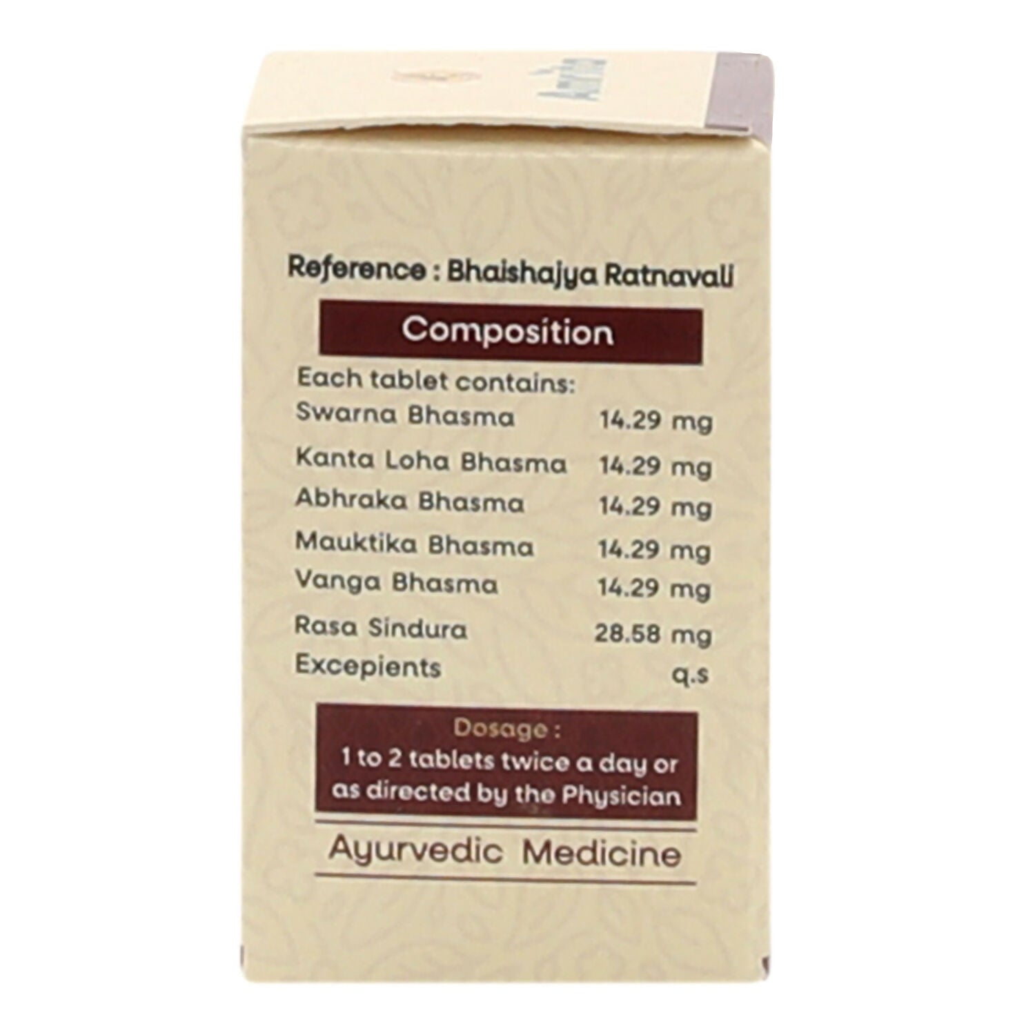 • Swarna Bhasma, Kanta Loha Bhasma, Abhraka Bhasma, Mauktika Bhasma, Vanga Bhasma, Rasa Sindhura, Kumari (Aloe Vera) juice