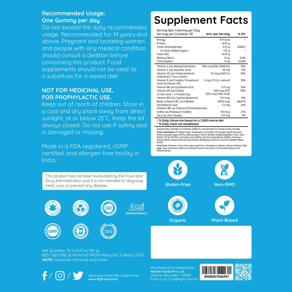 Purna Gummies Biotin Blueberry Flavour Gummies with Vitamin B 12 for Stronger Hair and Nails